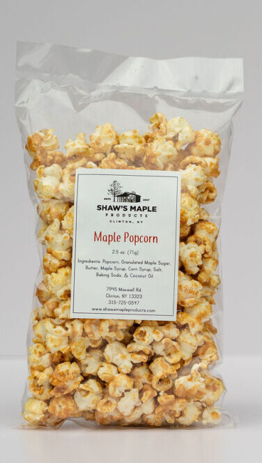 A maple version of a caramel popcorn. Crispy, light and delicious. Hand made in small batches to ensure freshness and quality. 2.5 oz bag.